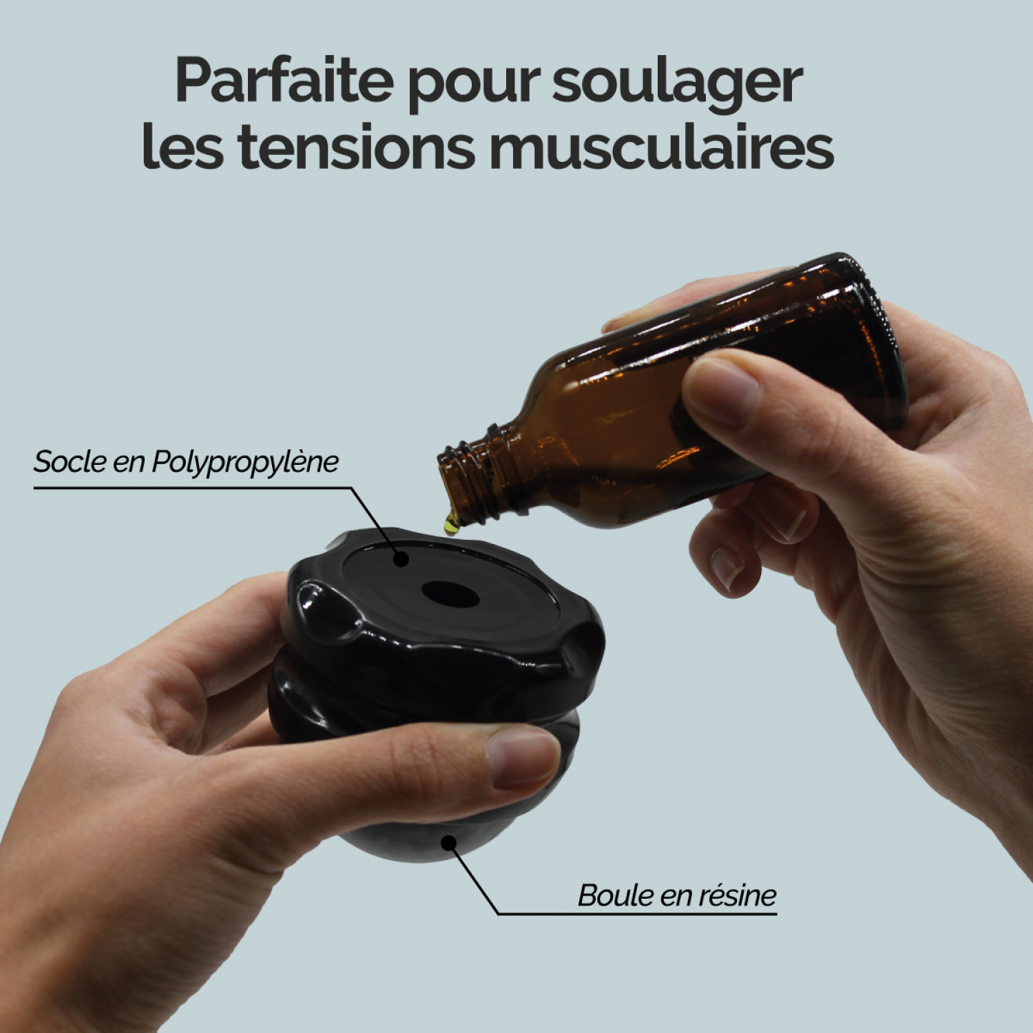 Pour enrichir l’expérience, un trou situé sous la boule est spécialement prévu pour y déposer quelques gouttes d’huile de massage. Elle facilite la glisse, nourrit la peau et intensifie la sensation de détente, transformant chaque séance en véritable moment de bien-être.