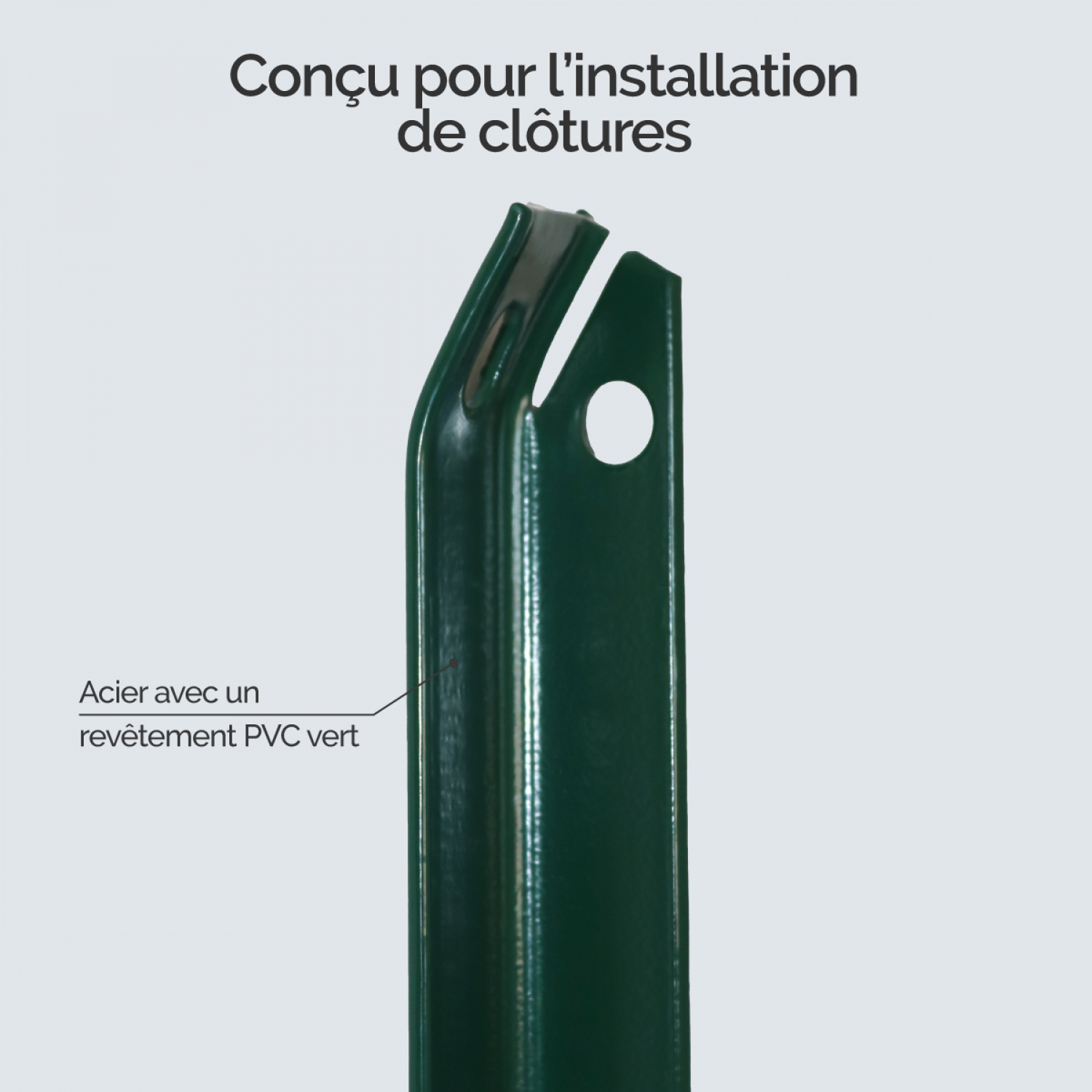 D’une hauteur de 2 mètres, ce piquet est fabriqué en acier et bénéficie d’un revêtement PVC vert qui le protège efficacement contre la corrosion, l’humidité et les agressions extérieures. Sa section de 2,5 x 2,5 cm lui confère une bonne rigidité et une excellente résistance mécanique, parfaitement adaptées au maintien des clôtures grillagées.