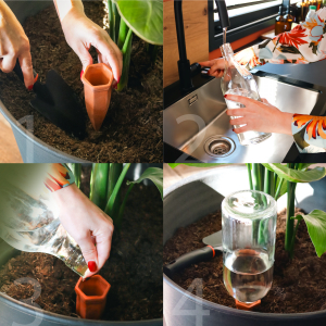 L'installation est très simple. Créez un trou dans votre terre puis déposez le cône. Remplissez une bouteille d'eau. Retenez l'évacuation avec vos doigts puis placez l'embout dans le cône.