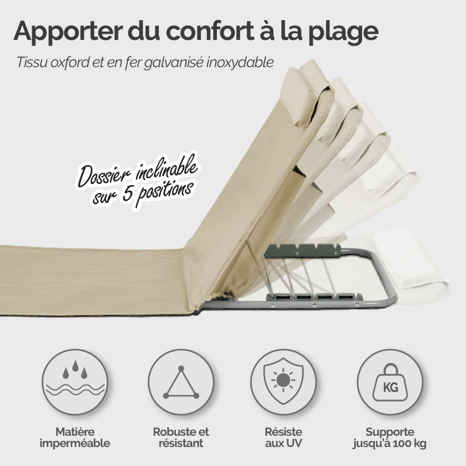 Conçu en tissu Oxford résistant et renforcé par une structure en fer galvanisé inoxydable, il fait face sans difficulté au sable, aux UV et aux éclaboussures d'eau salée. Solide et fiable, il supporte jusqu'à 100 kg, tout en restant facile à entretenir.