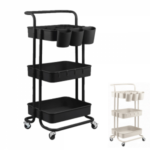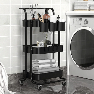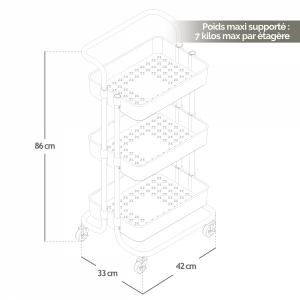 Fabriqué en ABS et en acier au carbone, ce chariot combine solidité et durabilité. Chaque étagère peut supporter jusqu’à 7 kg, vous offrant une capacité de stockage généreuse pour ranger produits ménagers, accessoires de salle de bain, fournitures de bureau ou ustensiles de cuisine.