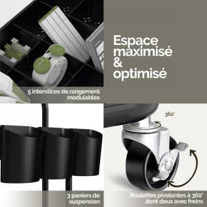 🛠️ ROBUSTE & FONCTIONNEL Fabriqué en ABS et acier au carbone, il combine solidité et durabilité. Chaque étagère supporte jusqu'à 7 kg, offrant une capacité généreuse pour vos produits ménagers, accessoires de salle de bain, fournitures de bureau ou ustensiles de cuisine.