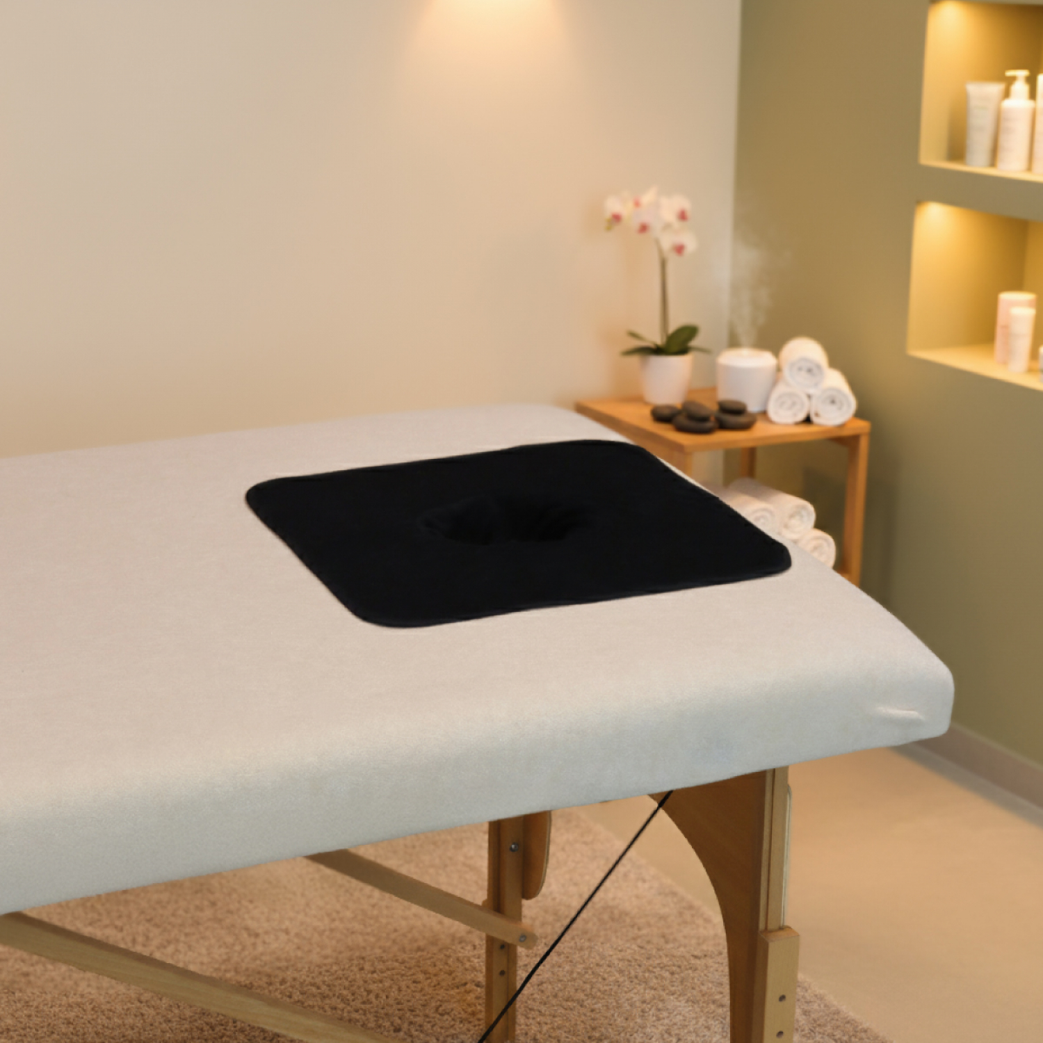 📏 DIMENSIONS ADAPTÉES Avec ses dimensions de 35 x 35 cm et son trou central de 14 cm, elle s'adapte parfaitement à la majorité des tables de massage. La cavité visage est ainsi protégée, tout en permettant une respiration fluide et naturelle lorsque le client est installé en position ventrale.