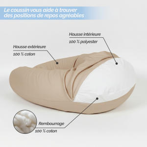 Pendant la grossesse, il aide à trouver une position de sommeil confortable en soutenant le ventre, les jambes ou le dos, réduisant ainsi les tensions et favorisant un meilleur repos. Lors de l'allaitement ou du biberon, il place le bébé à la bonne hauteur pour soulager les bras, les épaules et le dos, permettant de nourrir dans une position plus naturelle et sans effort. Enfin, en dehors de ces moments, il se transforme en un coussin de relaxation, parfait pour s'installer confortablement et profiter d'instants de détente.