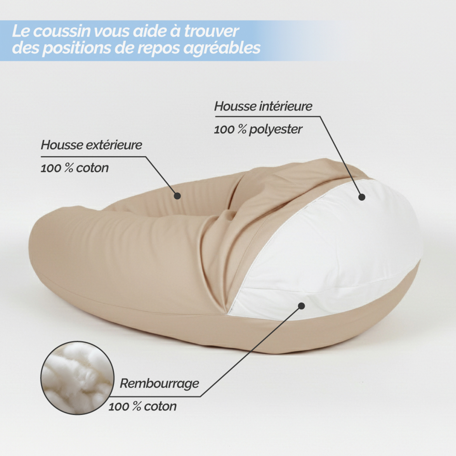 ☁️MATIÈRES & SÉCURITÉ Le rembourrage 100 % coton lui confère un confort moelleux et durable, tandis que la housse intérieure en polyester protège le garnissage et assure une meilleure tenue dans le temps. La housse extérieure en 100 % coton, douce et agréable au toucher, apporte une véritable sensation de cocooning. Pour une sécurité totale, toutes les matières bénéficient d'un traitement anti-inflammabilité.