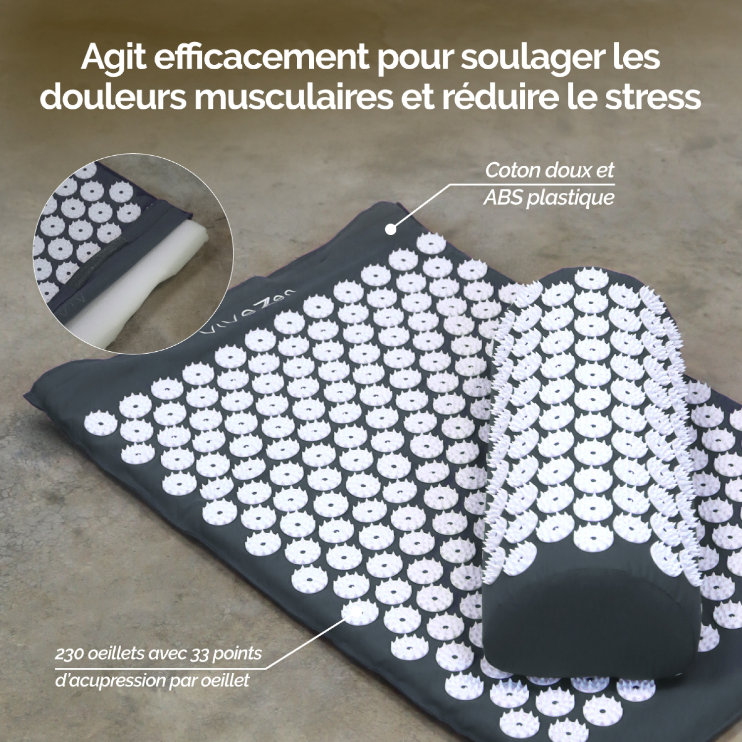 Offrez-vous chaque jour un véritable moment de détente et de bien-être directement chez vous grâce au tapis et coussin d'acupression Vivezen.