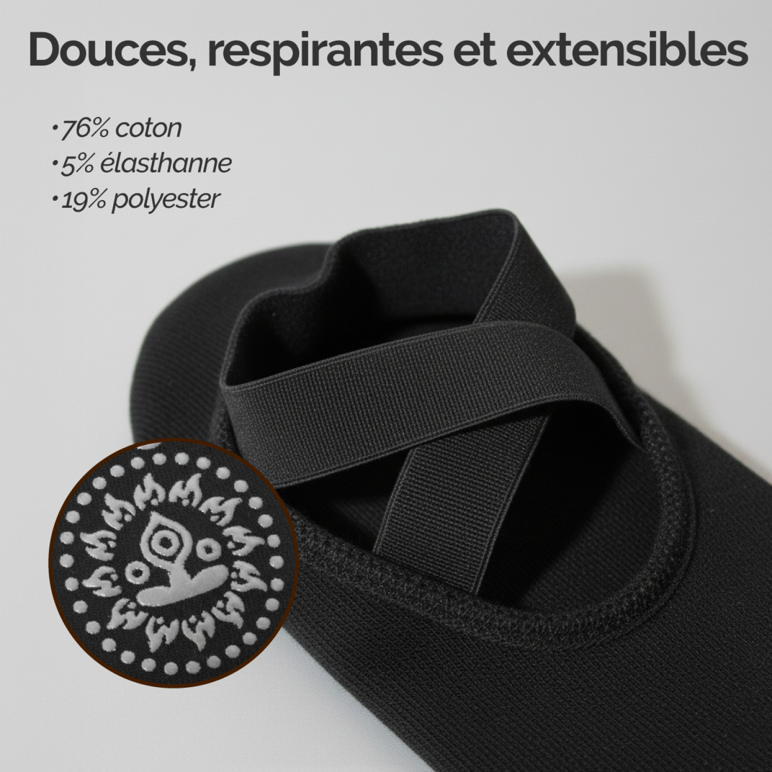 🌿 MATÉRIAUX DE QUALITÉ Fabriquées à partir d'un mélange de 76 % coton, 19 % polyester et 5 % élasthanne, elles sont douces, respirantes et extensibles. Le coton apporte confort et légèreté, le polyester assure une excellente résistance à l'usure et l'élasthanne garantit une élasticité parfaite pour accompagner tous vos mouvements. Elles gardent vos pieds au chaud, même dans les salles climatisées ou en hiver, tout en évitant le contact direct avec le tapis pour une hygiène renforcée.